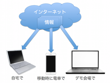 地理的に離れたメンバ同士の情報共有を円滑にできるといったメリットがあります。以前であれば、作成した資料を読んでもらいたい場合、わざわざメールする必要がありましたが、クラウドストレージを用いることで自分のパソコンに資料を保存すれば相手のパソコンにも同じ資料が瞬時に保存されるという機能があります。つまり「自分のパソコン→クラウドストレージ→相手のパソコン」というように情報が自動的に同期される仕組みです。地理的に離れたメンバで構成されたチームにおいて常に最新の情報を共有できることの素晴らしさについての説明は不要でしょう。このように情報が一元化されることで、