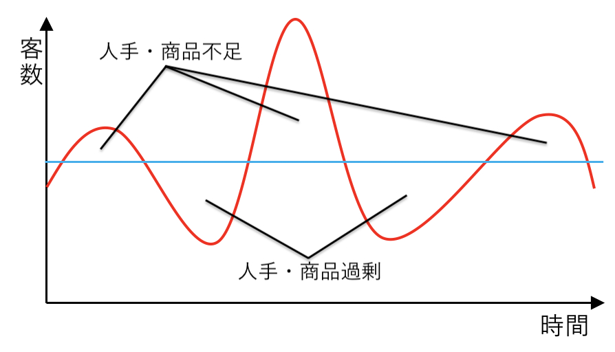 似たようなことでお店や飲食店、遊園地等でお客さんが全く入らないのは、商品が売れ残り店員は暇で明らかにダメですが、その反対に殺到されても困ってしまいます。商品が売り切れてしまったり、順番を待つ行列が長くなったり、更には店員が対応しきれずにサービス品質が低下したりと、お客さんの不満を大きくしてしまいます。そこで重要なのが、お客さんの来店数を時間的に平らにならすことです。手段として例えば以下が考えられます。